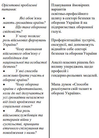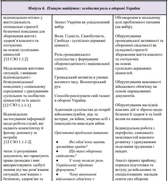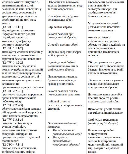 - 10 класс: содержание посвящено вопросам нацбезопасности и обороны Украины, ознакомлению с основами управления и планирования, вооружению и военной технике, стрелковой подготовке, ориентированию на местности, инженерной фортификации, медицинской помощи;