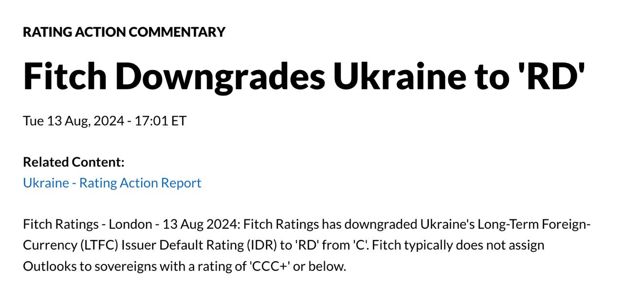 Рейтинговое агентство Fitch Ratings понизило рейтинг Украины с уровня С до RD - ограниченный дефолт.