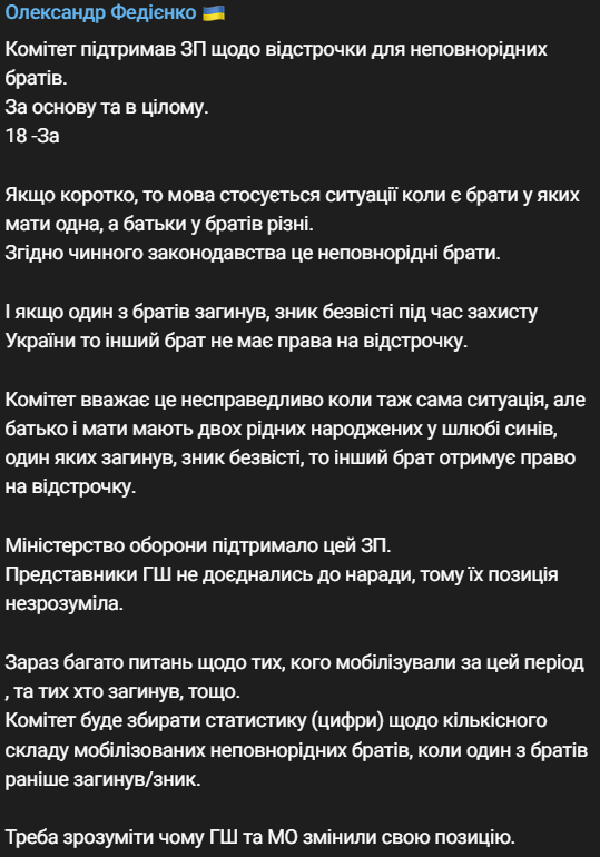 "Сейчас много вопросов относительно тех, кого мобилизовали за этот период и тех, кто погиб, и тому подобное. Комитет будет собирать статистику (цифры) относительно количественного состава мобилизованных неполнородных братьев, когда один из братьев ранее погиб/пропал. Надо понять, почему ГШ и МО изменили свою позицию", – пишет Федиенко.