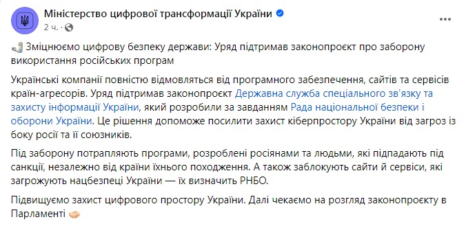 "Украинские компании полностью откажутся от программного обеспечения, сайтов и сервисов стран-агрессоров. Правительство поддержало законопроект Государственной службы специальной связи и защиты информации Украины, который разработали по заданию Совета национальной безопасности и обороны Украины. Это решение поможет усилить защиту киберпространства Украины от угроз со стороны России и ее союзников", - сказано в публикации.