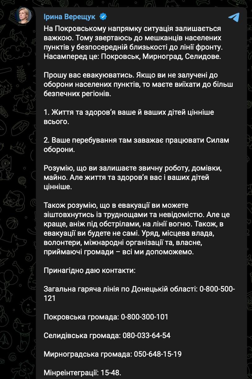 Между тем вице-премьер Ирина Верещук заявила, что из -за ухудшения ситуации на Покровском направлении жителям Селидово, Покровска и Мирнограда нужно выезжать из городов.