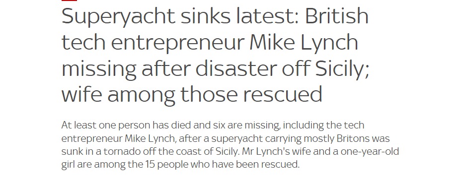 Мультимиллионер Майк Линч, широко известный как "британский Билл Гейтс", пропал без вести после крушения роскошной яхты Bayesian у побережья Сицилии. Принадлежавшая Линчу яхта попала в смерч и затонула.