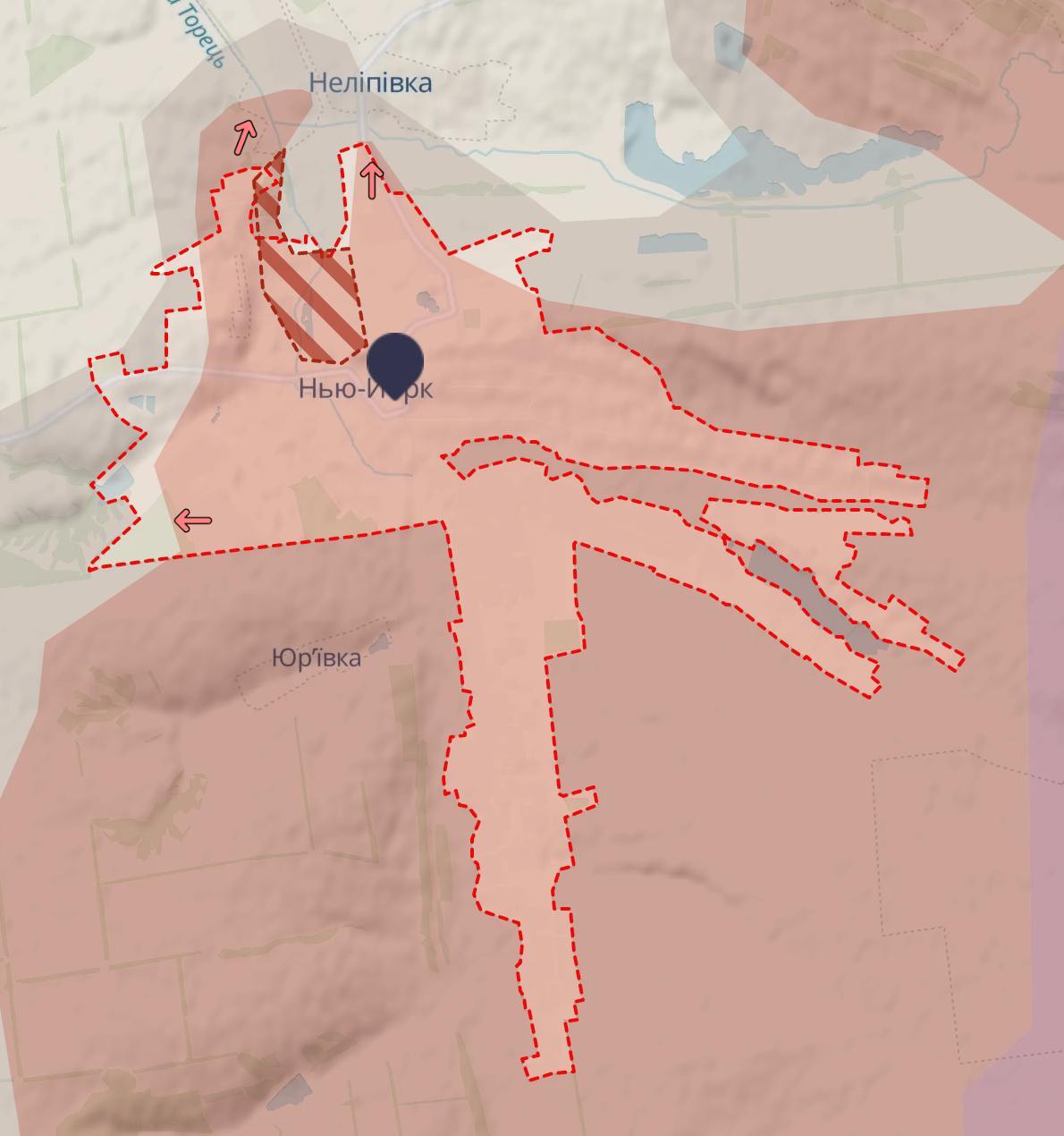 Сейчас на карте ресурса в Нью-Йорке не указано территорий под контролем ВСУ. Только некоторые окраины обозначены в серой зоне, то есть за них еще идут бои и ни одна из сторон там не закрепилась.