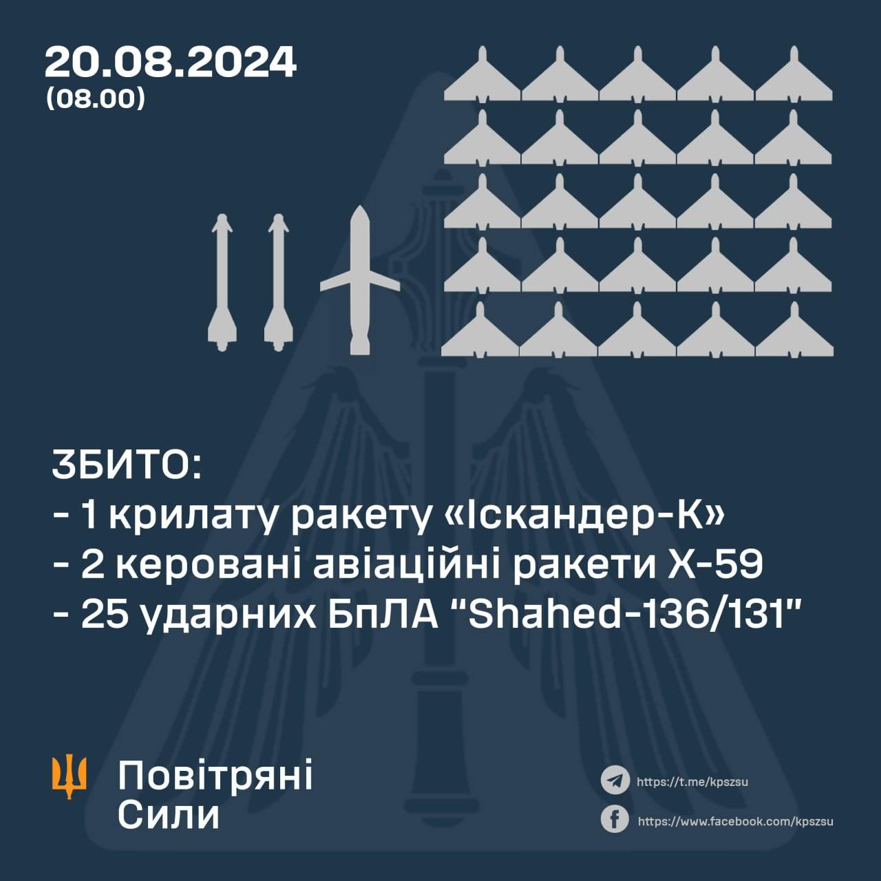 8.23 Ночью Украина сбила 25 из 26 беспилотников "Шахед", один из трех "Искандеров" и две авиаракеты Х-59.