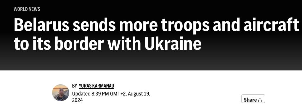 8.33 Беларусь отправляет больше войск, сил ПВО и самолетов к своей границе с Украиной, пишет Associated Press.