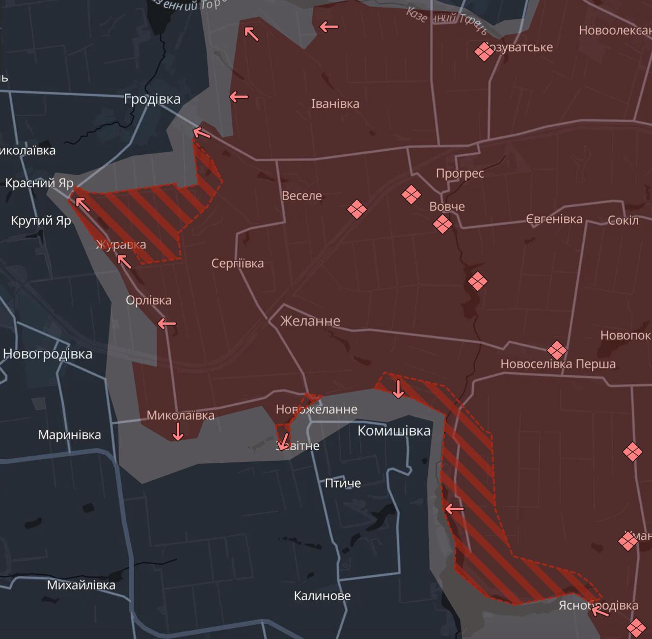 Ранее Deep State сообщал о продвижении россиян в поселке. Сейчас на карте ресурса в Нью-Йорке не указано территорий под контролем ВСУ. Только некоторые окраины обозначены в серой зоне.