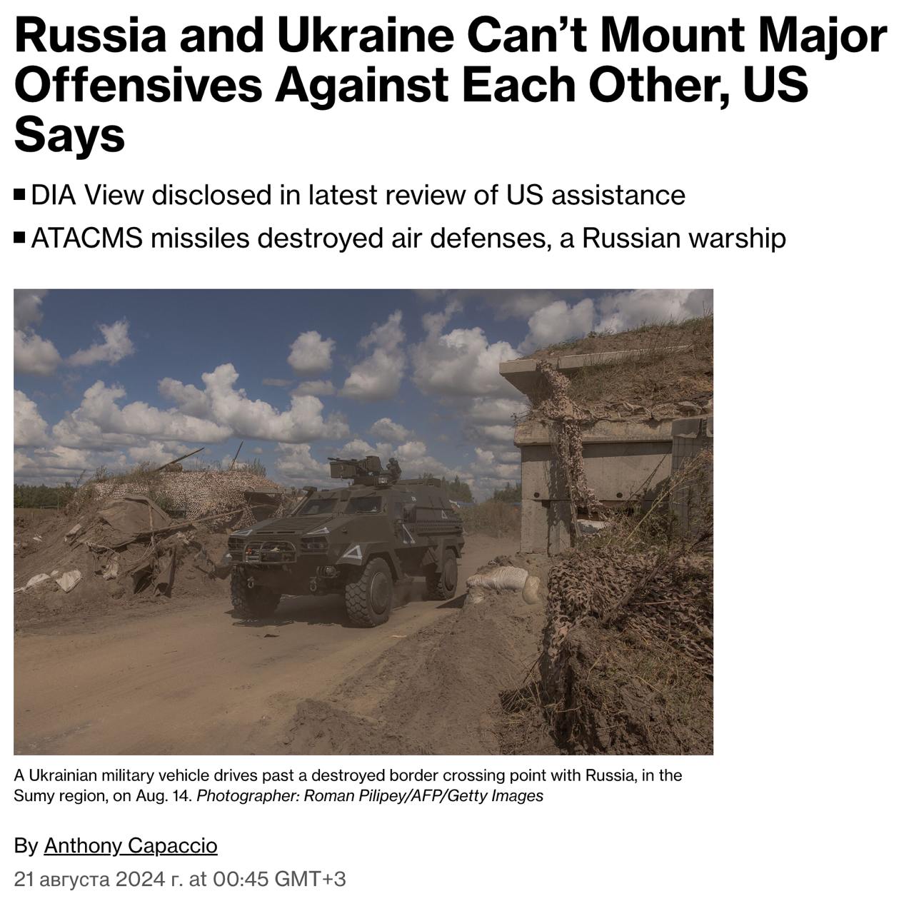 Разведывательное управление министерства обороны США считает, что война в Украине движется к тупику, так как ни у Киева, ни у Москвы нет достаточных военных ресурсов для проведения масштабных наступательных операций.