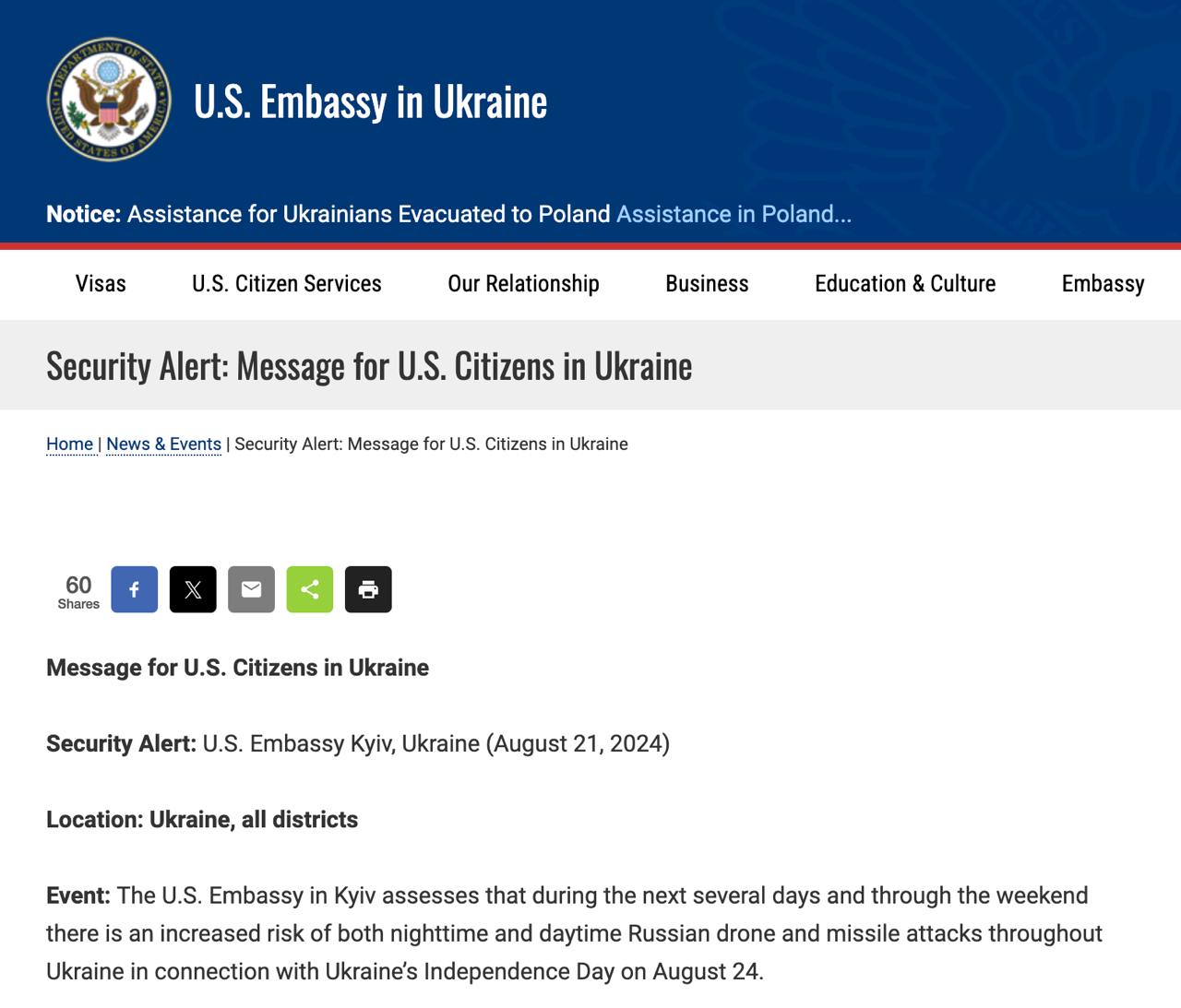 "В течение следующих нескольких дней и по выходным существует повышенный риск как ночных, так и дневных российских беспилотных и ракетных атак по всей территории Украины в связи с Днем независимости Украины 24 августа", - говорится в сообщении посольства США в Украине.