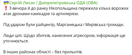 08:05 Ночью Никопольский район россияне обстреливали дронами-камикадзе и артиллерией. Об этом сообщил глава Днепропетровской ОВА Сергей Лысак.