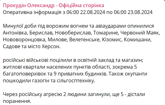08:10 За прошедшие сутки в Херсонской области из-за российской агрессии 2 человека погибли, еще 5 - получили ранения.