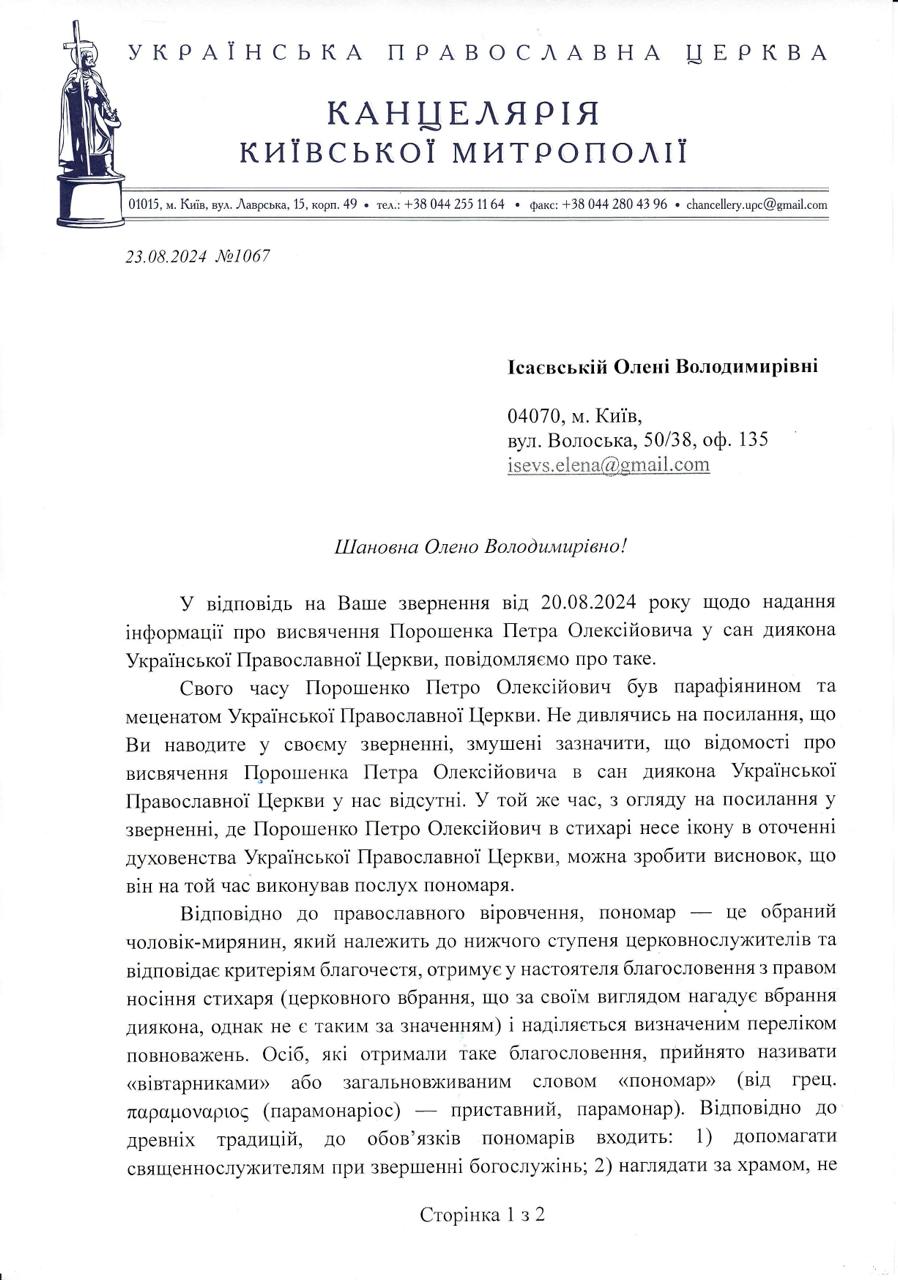 Адвокат Елена Исаевская подала запрос УПЦ с вопросом, был ли Порошенко рукоположен в диаконы церкви.