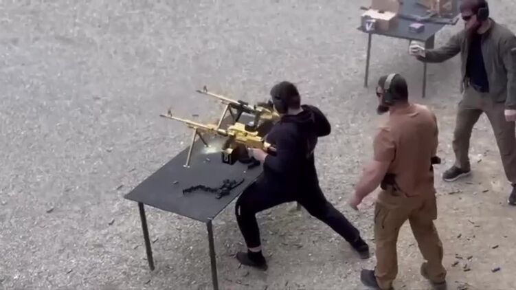 На кадрах молодой человек держит в каждой руке по автоматическому оружию золотого цвета и одновременно ведет огонь. Мишеней на записи не видно. Рядом стоят несколько мужчин. Один из них держит камеру и снимает происходящее.