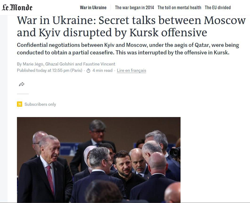 "Под эгидой Катара велись конфиденциальные переговоры между Киевом и Москвой с целью добиться частичного прекращения огня, которые были прерваны наступлением на Курской дуге", - говорится в статье.