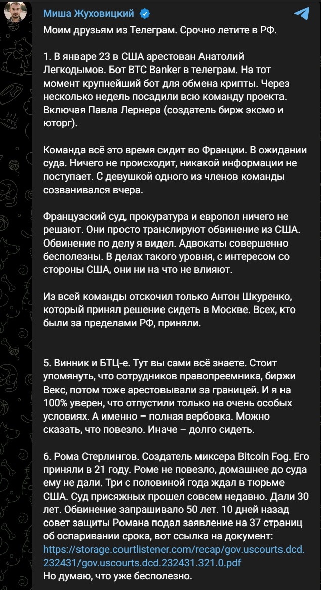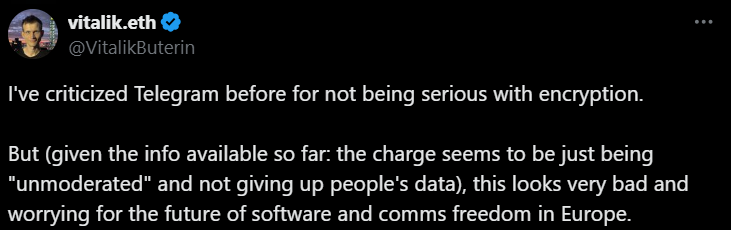 "Однако (учитывая имеющуюся на данный момент информацию: его обвиняют, по-видимому, просто в том, что он "не модерирует" и не раскрывает данные пользователей), это выглядит очень плохо и тревожно для будущего свободы программного обеспечения и коммуникаций в Европе", - написал Бутерин в соцсети Х.