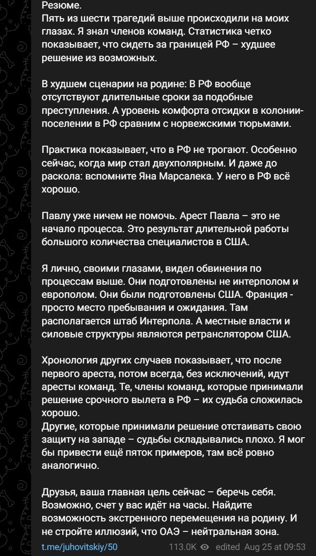 В то же время в России арест Дурова во Франции используют, чтоб вернуть обратно уехавших из страны россиян, в первую очередь айтишников. Призывы к возвращению в РФ, чтоб избежать ареста на Западе, уже распространяются по российским телеграм-каналам (многие российские айтишники после начала полномасштабной войны уехали за границу).