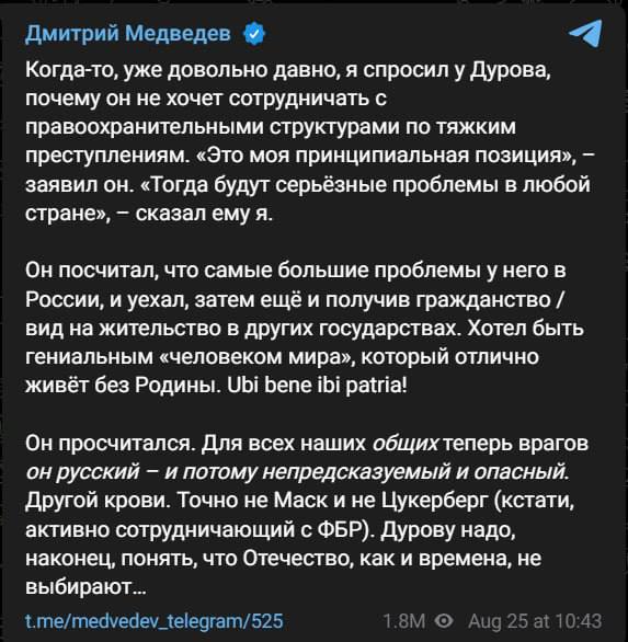 Дмитрий Медведев написал пост, где заявил, что Дуров "хотел быть гениальным "человеком мира", который отлично живёт без Родины. Он просчитался. Для всех наших общих теперь врагов он русский – и потому непредсказуемый и опасный. Другой крови. Точно не Маск и не Цукерберг (кстати, активно сотрудничающий с ФБР). Дурову надо, наконец, понять, что Отечество, как и времена, не выбирают".