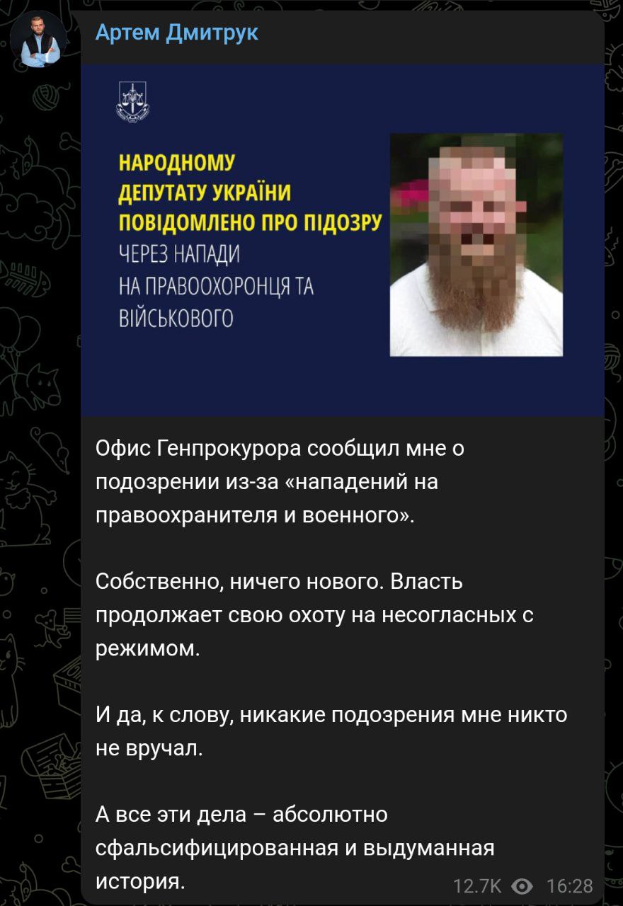 Напомним, сам Дмитрук ещё со вчерашнего дня в своем телеграм-канале сообщает, что спецслужбы его ищут по всей Украине, чтобы задержать, но найти не могут.