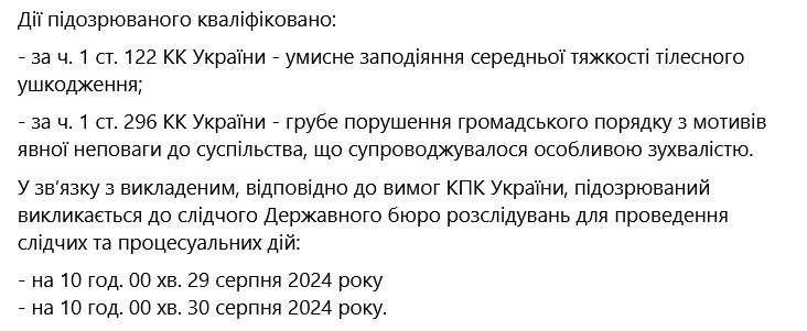 Генеральный прокурор сообщил о подозрении действующему народному депутату Украины по фактам совершения нападений группой лиц на правоохранителя и военного, покушения на похищение огнестрельного оружия, причинение потерпевшему средней тяжести телесных повреждений и хулиганство.