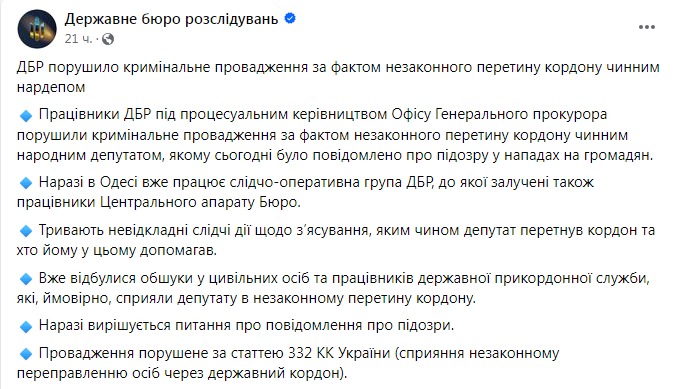 "Уже прошли обыски у гражданских лиц и работников государственной пограничной службы, которые, вероятно, способствовали депутату в незаконном пересечении границы", — говорится в сообщении ГБР.