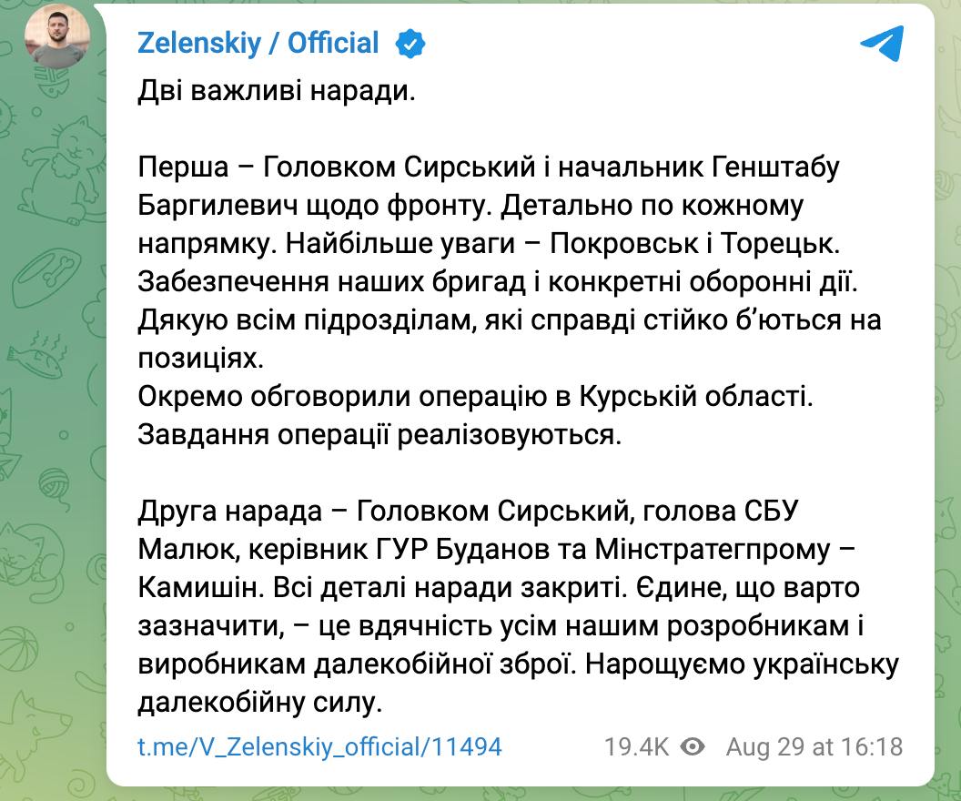 16.29 Зеленский сообщает, что провел совещания с военным руководством по ситуации на фронте и разработке дальнобойного оружия.