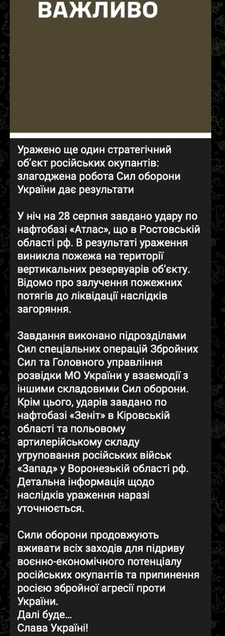 8.26 ВСУ подтвердили удар по нефтебазе "Атлас" в Ростовской области РФ вчера ночью.