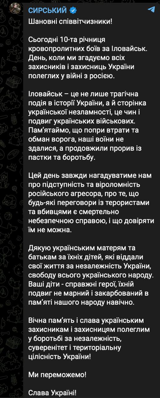 Главком ВСУ Александр Сырский сегодня написал пост, посвященный десятой годовщине Иловайского котла, который привел к очень большим потерям украинских войск, стал фактическом переломом в войне на Донбассе не в пользу Украины и принудил Киев пойти на заключение первых Минских соглашений о перемирии и особом статусе отдельных районов Донецкой и Луганской областей, контролируемых на тот момент "ЛДНР".