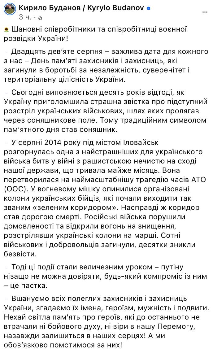 "Российские войска нарушили договоренности и открыли огонь на поражение, расстреляв украинские колонны на марше. Сотни военных и добровольцев погибли, десятки пропали без вести. Тогда эти события стали огромным уроком - Путину ни за что нельзя доверять, любой компромисс с ним - это ловушка", - сказал начальник украинской разведки.