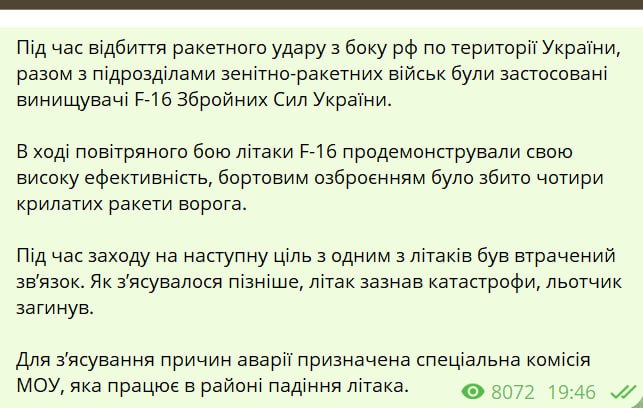 19.36 F-16, который потеряла Украина, пилотировал луцкий летчик Алексей Месь, сообщает CNN.