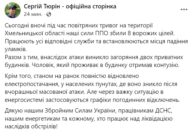 В результате атаки возникло возгорание двух частных домов. Мужчина, проживающий в доме, получил контузию, сообщил глава Хмельницкой ОВА Сергей Тюрин.