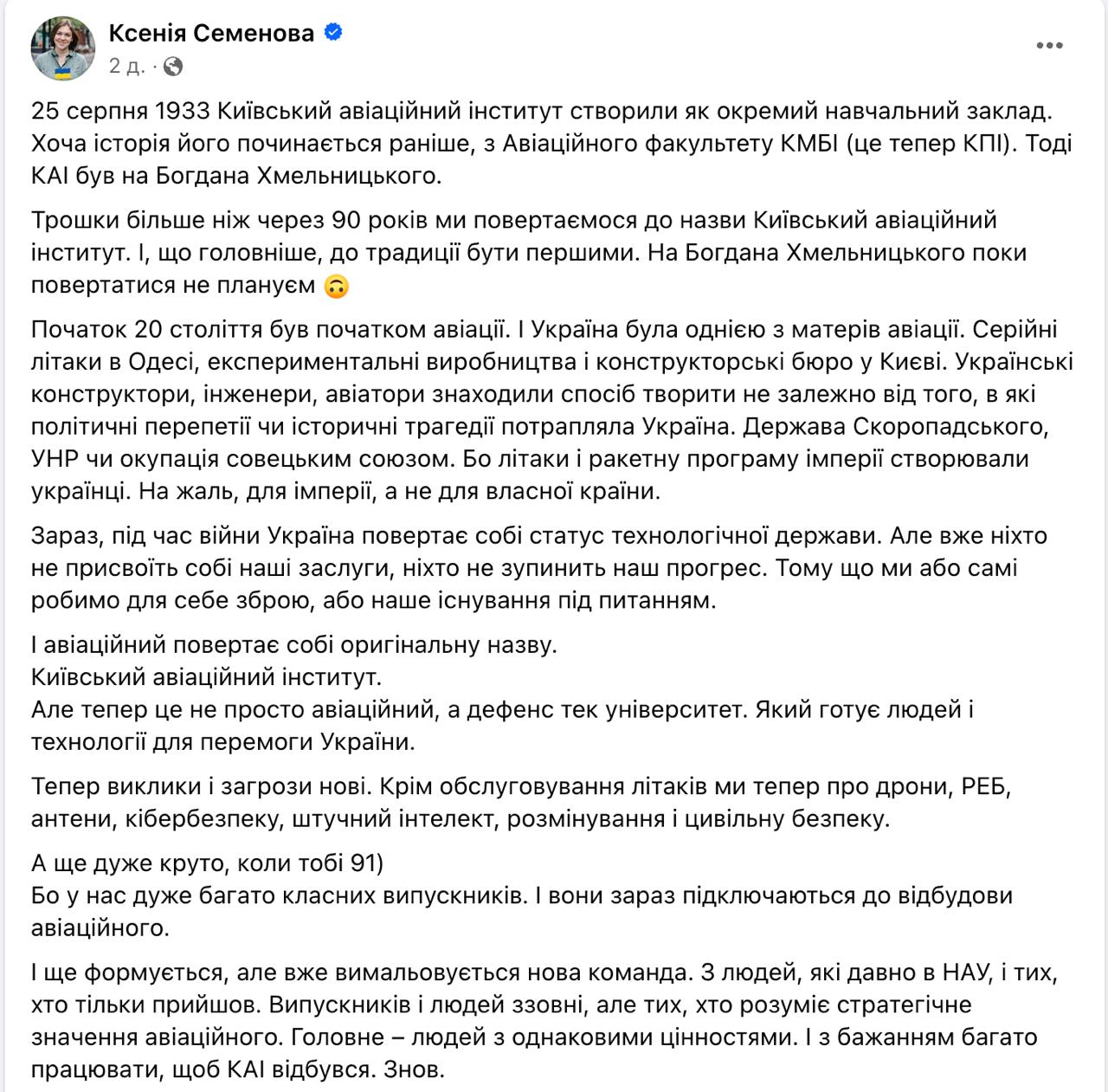"25 августа 1933 г. Киевский авиационный институт создали как отдельное учебное заведение. Хотя история его начинается раньше, с Авиационного факультета КГБИ (это теперь КПИ). Тогда КАИ был на Богдана Хмельницкого. Чуть больше чем через 90 лет мы возвращаемся к названию Киевский авиационный институт. И, что главнее, к традиции быть первыми", - написала Семенова.