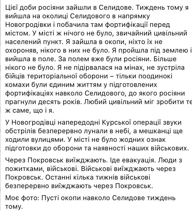 "Неделю тому назад я вышла на окраине Селидового в направлении Новогродовки и увидела там фортификации перед городом. В городе ничего не было, обычный гражданский населенный пункт. Я вошла в окопы, никто их не охранял, никого у них не было. Я прошла под землёй и вышла в поле. За полем уже были русские. Больше никого не было. Я не взорвалась на минах, не встретила бойцов территориальной обороны – только одиночные насекомые были единственной жизнью в подготовленных фортификациях вокруг Селидового, к которому россияне стремились десять лет. Любой гражданский мог сделать то же, что и я", - сообщила нардеп и опубликовала фото пустых траншей под Селидово.