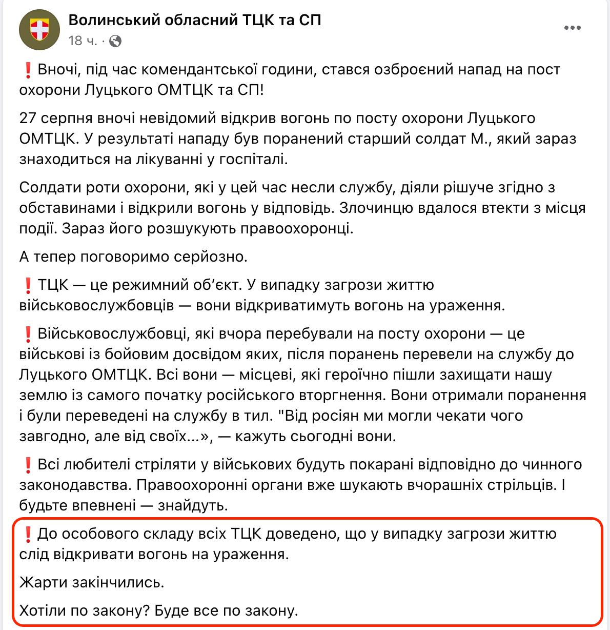 "До личного состава всех ТЦК доведено, что в случае угрозы жизни следует открывать огонь на поражение. Шутки закончились. Хотели по закону? Будет все по закону", - говорится в сообщении.
