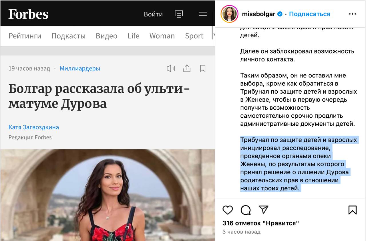 Об этом заявила в Инстаграме Ирина Болгар, которая называет себя матерью детей основателя Телеграма.