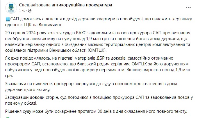 На основании материалов ГБР и доказательств, самостоятельно полученных прокурором САП, было установлено, что отец руководителя ТЦК по его поручению приобрел новую квартиру в пригороде Винницы и оформил ее на себя.
