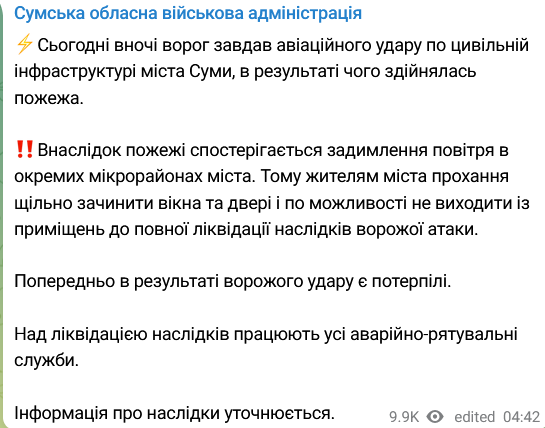 Об этом сообщила пресс-служба Сумской областной военной администрации.