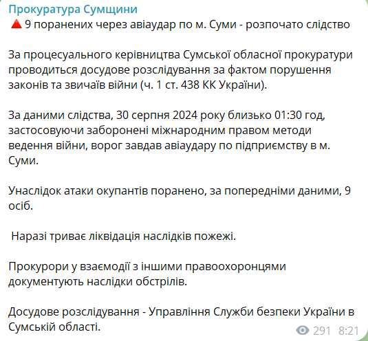 Ночью 30 августа Россия нанесла авиаудар по Сумам. Под обстрел попало предприятие, произошел пожар.