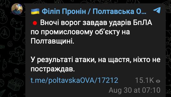 Также ночью российские беспилотники нанесли удар по промышленному объекту в Полтавской области, заявили в ОВА. Пострадавших нет.