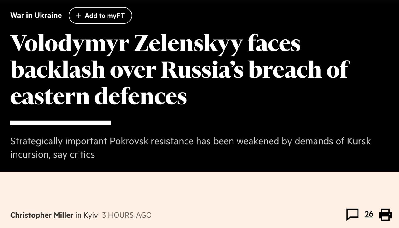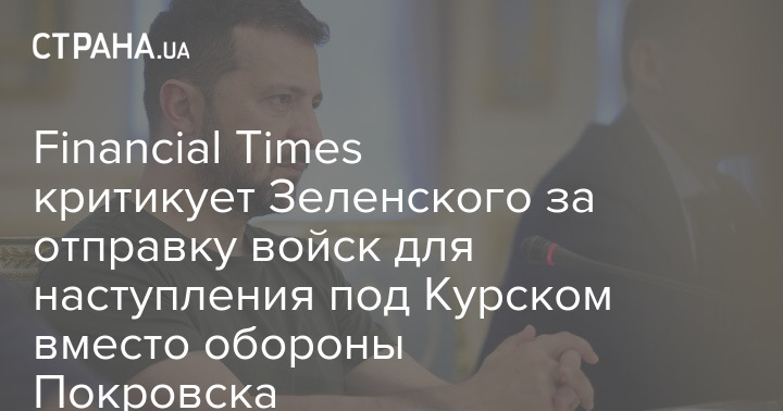 В газете Financial Times вышла статья с критикой президента Украины Владимира Зеленского из-за решения отправить войска наступать под Курском, а не оборонять Покровск.