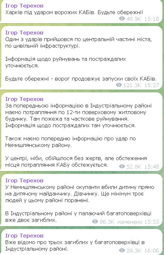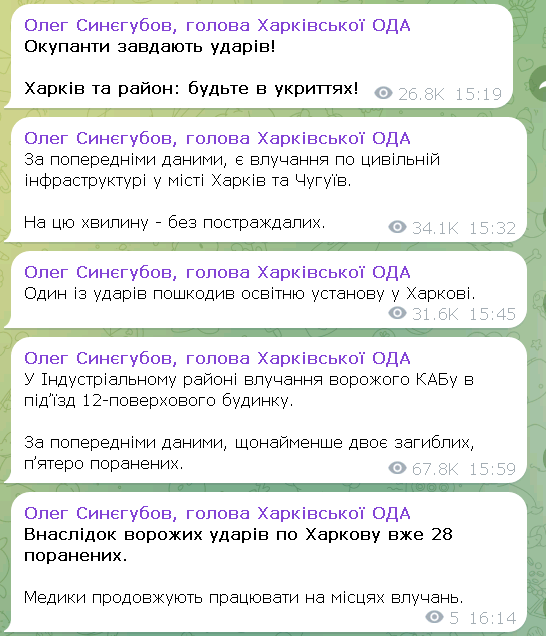 О первых последствиях прилетов сообщают мэр Харькова Игорь Терехов и глава Харьковской ОВА Олег Синегубов.