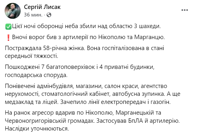 "Наутро агрессор ударил по Никополю, Марганецкой и Красногригоревской громадам. Применил БПЛА и артиллерию. Последствия уточняются", - добавил Лысак.
