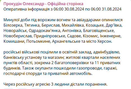За прошедшие сутки под вражеским огнем и авиаударами оказались Белозерка, Тягинка, Берислав, Михайловка, Казацкое, Дарьевка, Новорайск, Одрадокаменка, Антоновка, Благовещенское, Новоберислав, Приднепровский, Садовый, Кизомис, Инженерный, Комишаны .