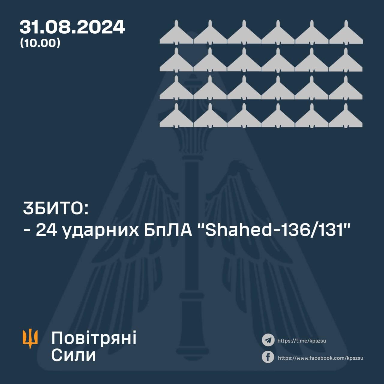 "В результате противовоздушного боя сбиты 24 ударных БПЛА "Shahed-131/136", 25 – локационно потеряны (упали самостоятельно). Два беспилотника полетели в направлении россии, еще один – в республику беларусь", - говорится в сообщении.