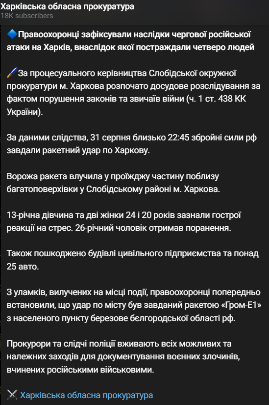 Из обломков, изъятых на месте происшествия, правоохранители предварительно установили, что удар по городу был нанесен ракетой "Гром-Е1" из Белгородской области РФ.