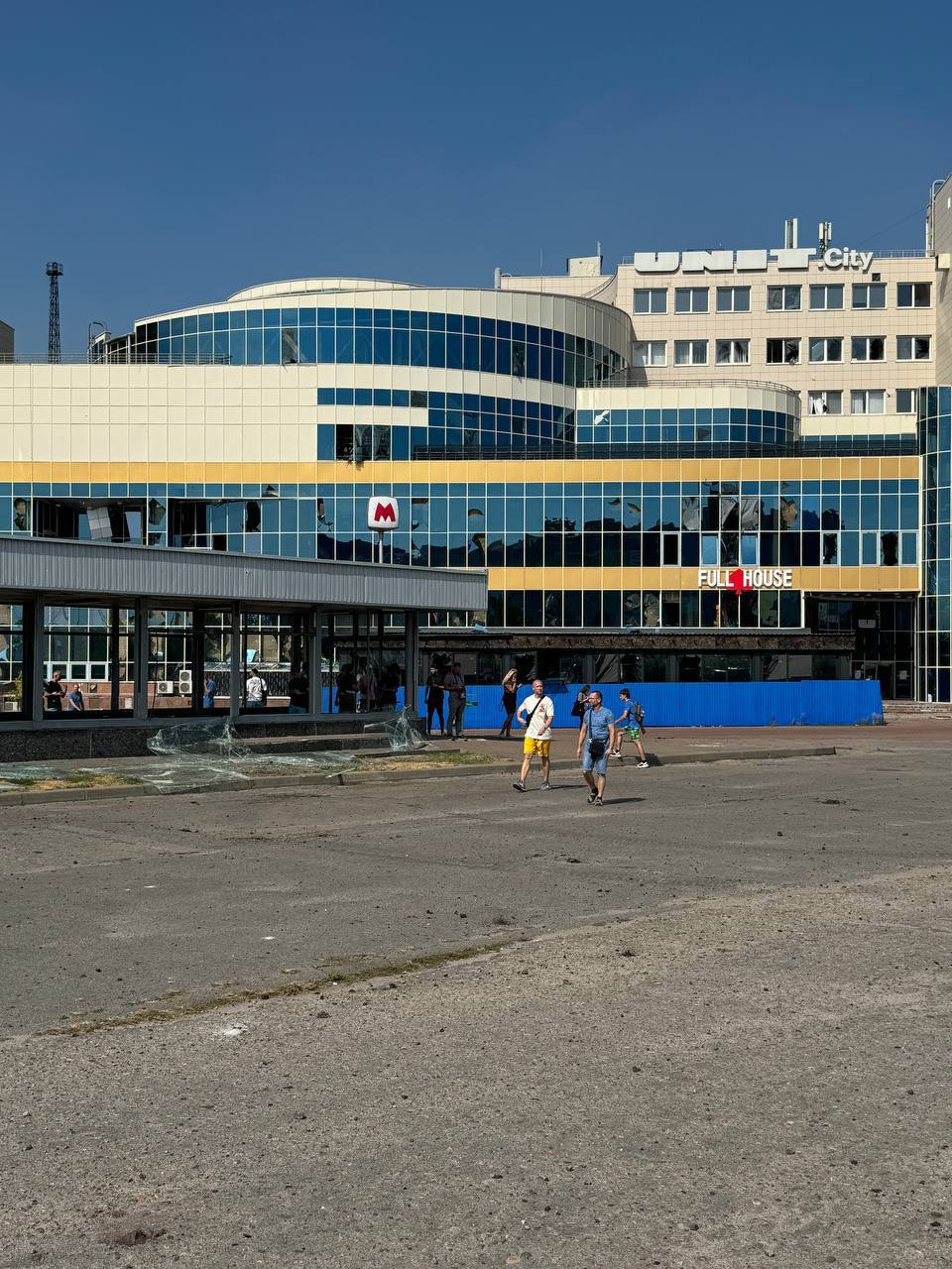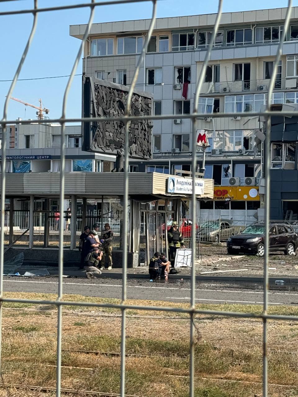 Последствия прилёта в районе станции метро Академика Павлова. Видны разрушения торгового центра и повреждения газопровода.
