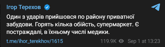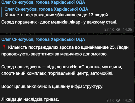 Сегодня днем россияне нанесли по Харькову около 10 ударов, есть повреждения гражданской инфраструктуры и потерпевшие. Удар наносился ракетами.