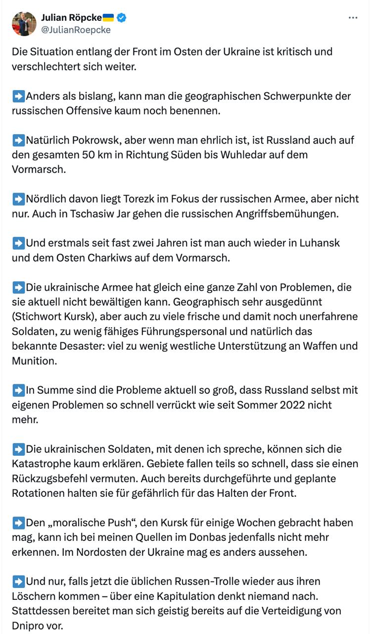 "Украинские солдаты, с которыми я разговариваю, едва могут понять происходящую катастрофу. Территории иногда утрачиваются настолько быстро, как будто был отдан приказ на отступление. Уже проведенные и запланированные ротации они также считают опасными для удержания фронта", - пишет Репке.