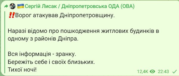 22.46 В результате взрывов в Днепре поврежден жилой дом, сообщает глава ОВА Лысак.