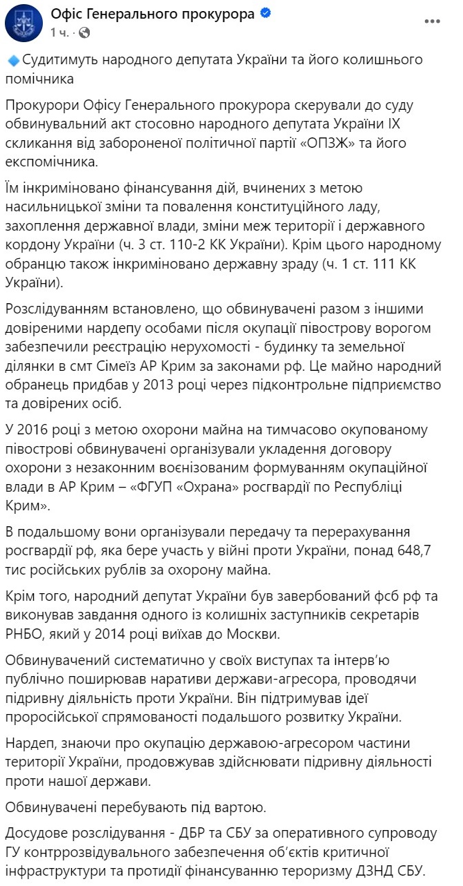 "Кроме того, народный депутат Украины был завербован фсб рф и выполнял задачи одного из бывших заместителей секретарей СНБО, который в 2014 году выехал в Москву.
