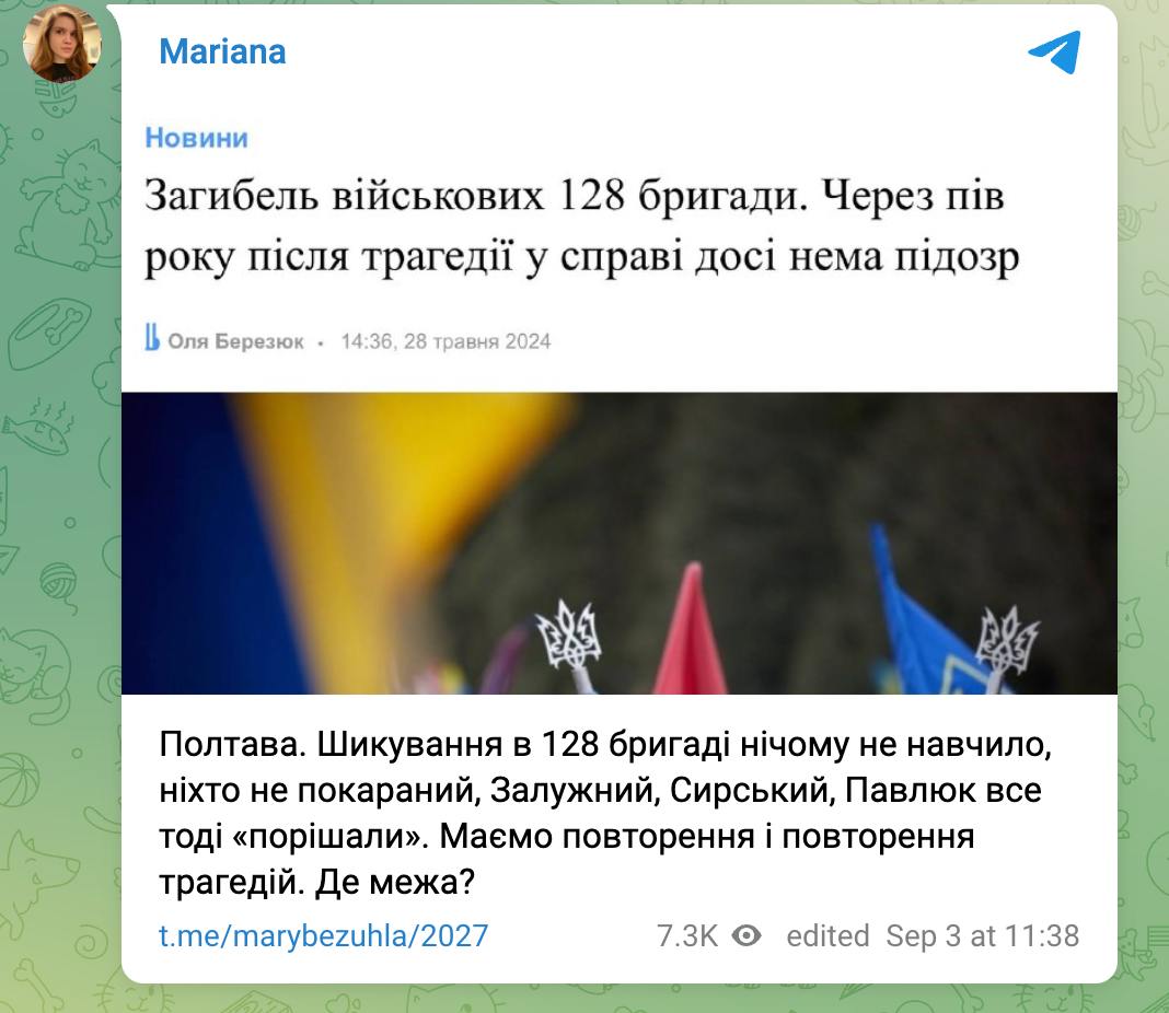 "Полтава. Построение в 128 бригаде ничему не научило, никто не наказан, Залужный, Сырский, Павлюк все тогда "решали". Есть повторение и повторение трагедий. Где предел?" - пишет нардеп.