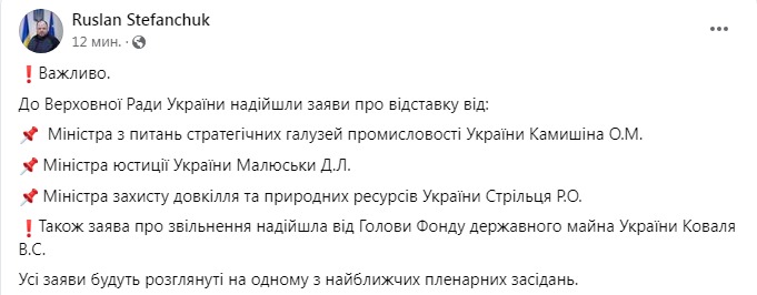 Между тем спикер парламента Руслан Стефанчук написал в Фейсбуке, что в Раду поступили заявления трех министров об отставке: